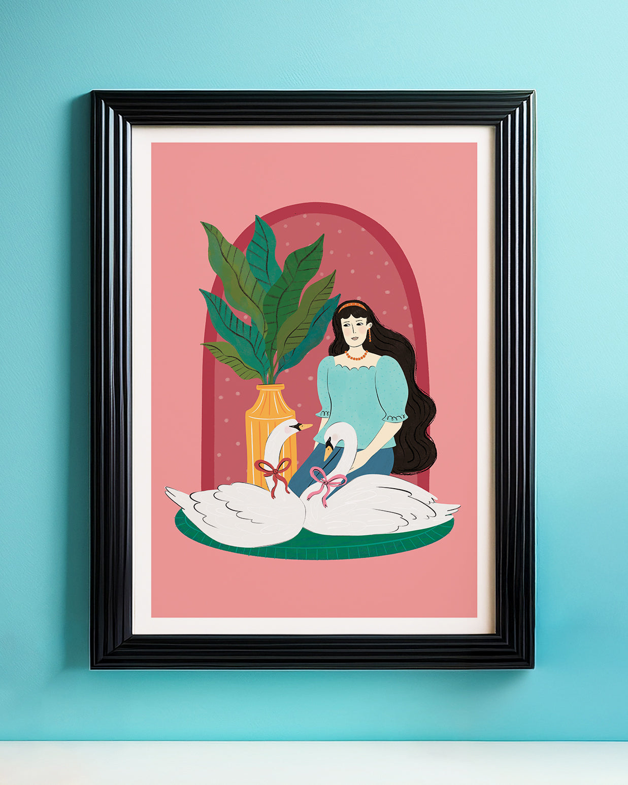 This charming art print blends modern illustration with nostalgic aesthetics, depicting a woman nestled close to two elegant swans adorned with ribbons. A wonderfully unique piece that brings feminine grace and playful vintage vibes to your space.